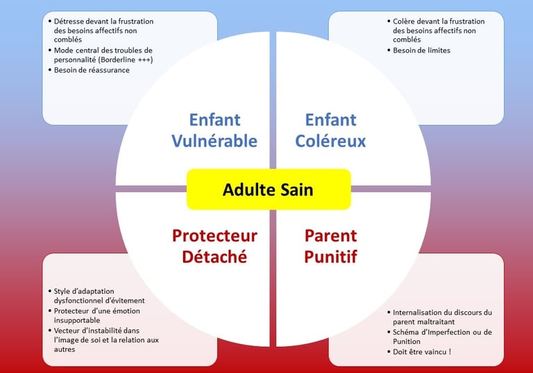 La thérapie des schémas : mieux se comprendre pour mieux avancer. Derrière ces comportements et ces émotions, il y a une part de vous qui souffre : votre enfant intérieur vulnérable. Cet enfant blessé a appris à se protéger en développant des stratégies automatiques, appelées modes, qui peuvent aujourd’hui vous empêcher d’être pleinement épanoui(e).
